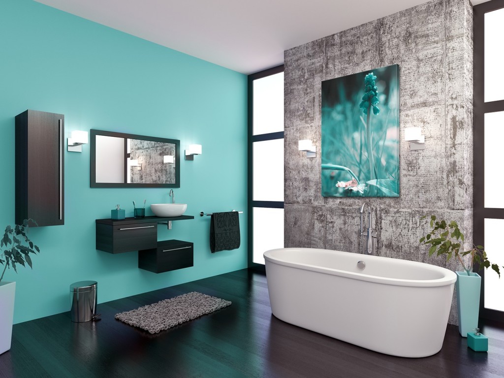 Wprowadźmy do łazienki turkusowe akcesoria, w postaci chociażby wspomnianego wieszaka na ręczniki lub samego ręcznika. Są to drobiazgi, ale wprowadzenie ich w szarej łazience da jej nowe życie. Turkus możecie również zastosować w postaci kolorowej baterii umywalkowej – na rynku znajdziecie ich trochę, a producenci co chwila wprowadzają do oferty np. kolorową armaturę. Możecie także pomyśleć o przemyceniu koloru w innych, nietypowych rzeczach, jak np. wieszając na ścianie turkusowy obraz, czy grafikę lub kładąc obok mebli ozdobną turkusową wagę łazienkową. Wszystkie dodatki w jednym kolorze zharmonizują łazienkę.