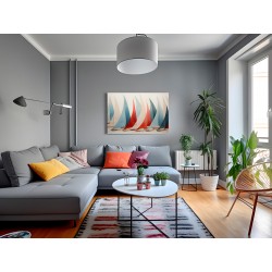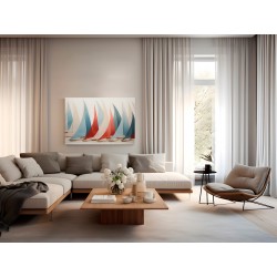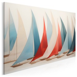 Obraz przedstawia flotyllę żaglówek z wysokimi, smukłymi żaglami w odcieniach błękitu, czerwieni i beżu, rozpiętymi na cienkich masztach. Minimalistyczna kompozycja z delikatnymi liniami i jasnym tłem nadaje scenie lekkości, a subtelne cieniowanie i przejścia kolorystyczne dodają głębi i elegancji.