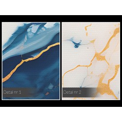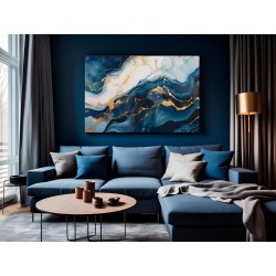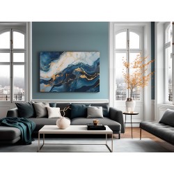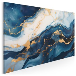 Złote żyły przypominające błyskawice lub sieci rzeczne dramatycznie kontrastują z głębokimi błękitami i bielą wirującymi razem, przywołując naturalne wzory, które można zobaczyć w marmurowym kamieniu lub widoki z lotu ptaka na zjawiska oceaniczne i geologiczne. Kompozycja jest abstrakcyjna, a jednocześnie organiczna, wciągając widza w złożoność płynnych kształtów i żywych kolorów.