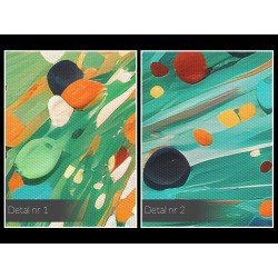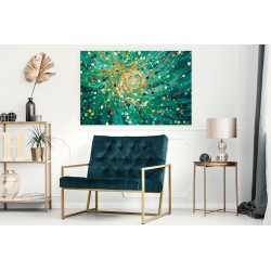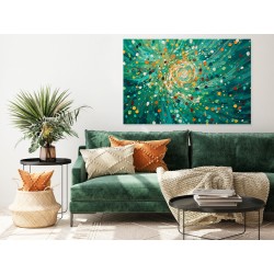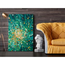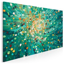 Ten obraz przedstawia abstrakcyjny wir energii, pełen dynamicznych pociągnięć pędzla i kolorowych kropek. Dominująca zielono-turkusowa paleta barw nadaje mu świeżości i głębi, podczas gdy ciepłe akcenty pomarańczu i żółci dodają kontrastu i ruchu. Całość sprawia wrażenie wirującej galaktyki lub wciągającego tunelu świetlnego, co czyni go doskonałym elementem dekoracyjnym do nowoczesnych wnętrz. Idealny dla osób lubiących abstrakcyjne, energetyczne kompozycje.