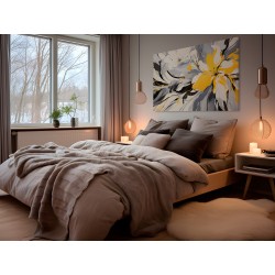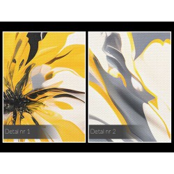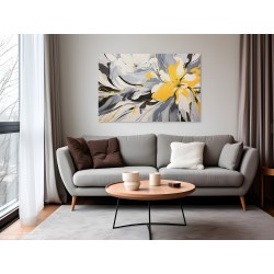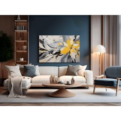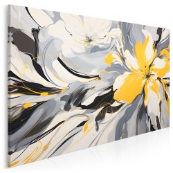 Ten obraz przedstawia abstrakcyjne kwiaty w dynamicznej kompozycji kolorystycznej. Dominuje elegancka paleta bieli, szarości i czerni z intensywnymi akcentami żółci, które nadają całości energii i kontrastu. Płynne, rozlane formy tworzą efekt ruchu, przypominający ekspresjonistyczne malarstwo. Taka dekoracja doskonale sprawdzi się w nowoczesnych wnętrzach, dodając im wyrazistości i subtelnej elegancji.