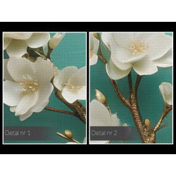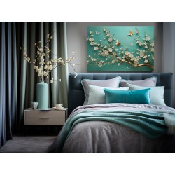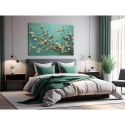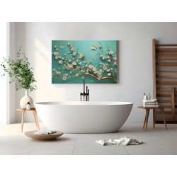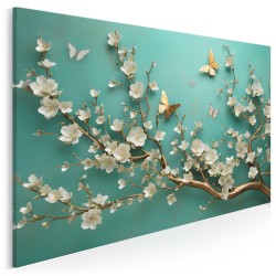 Ten obraz przedstawia gałęzie kwitnącego drzewa z delikatnymi białymi kwiatami i złotymi motylami na turkusowym tle. Kompozycja ma elegancki i dekoracyjny charakter, łącząc realizm z artystyczną stylizacją. Złote detale dodają mu luksusowego wyglądu, a pastelowa kolorystyka sprawia, że obraz wprowadza do wnętrza świeżość i lekkość. To idealny wybór do jasnych, stylowych aranżacji, gdzie może pełnić funkcję centralnej ozdoby, przyciągając wzrok i nadając przestrzeni harmonijny, naturalny klimat.