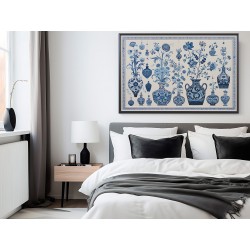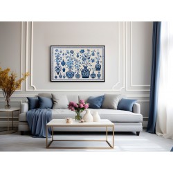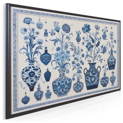 Kolekcja niebiesko-białych wzorów ceramiki jest elegancko przedstawiona, zawierając różne wazony i kompozycje kwiatowe. Każdy element charakteryzuje się szczegółowymi wzorami, a całość kompozycji ujęta jest w misterną ramkę.