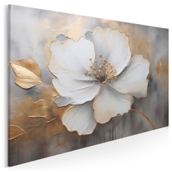 Centralnym punktem na mglistym szarym tle jest duży biały kwiat ze złotymi krawędziami. Szczegółowe pociągnięcia pędzlem ożywiają płatki i złote pręciki pośrodku.