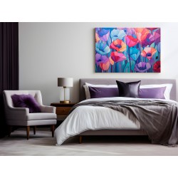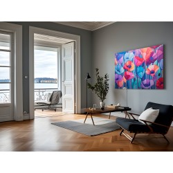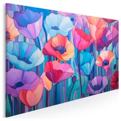 Żywe maki w odcieniach błękitu, fioletu, różu i czerwieni rozmieszczone są po całym kadrze, na tle pasiastego tła o różnych odcieniach błękitu. Każdy mak ma unikalną kombinację kolorów, która przyczynia się do ogólnej harmonii i żywego charakteru sceny.