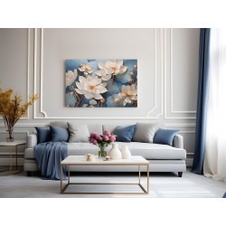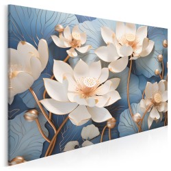 Kolekcja białych kwiatów lotosu została osadzona na kontrastowym niebieskim tle, podkreślając misterne detale płatków i pręcików. Kwiaty i liście wykazują trójwymiarową jakość, sugerującą głębię i fakturę.