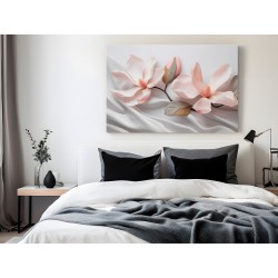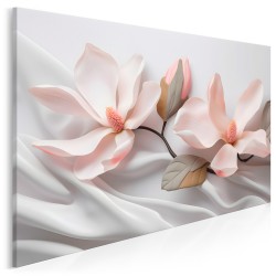 Delikatnie spoczywające na drapowanej, białej, jedwabistej tkaninie, trójwymiarowe kwiaty magnolii ukazują swoje delikatne różowe płatki i teksturowane środki. Subtelne cienie pod płatkami i liśćmi tworzą wrażenie głębi i spokoju.