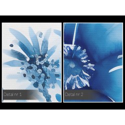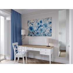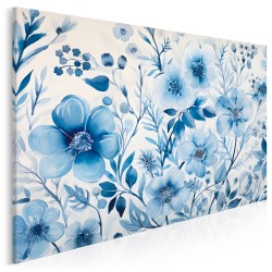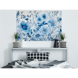 Ten obraz przedstawia piękny, monochromatyczny wzór kwiatowy w różnych odcieniach niebieskiego. Styl malarski przypomina akwarelę – delikatne przejścia kolorystyczne i przezroczyste warstwy nadają kompozycji lekkości.