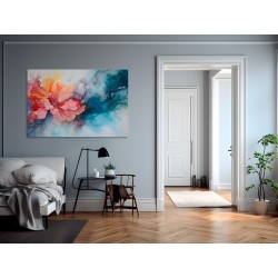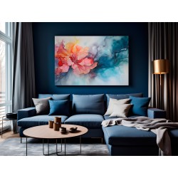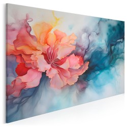 To niezwykle efektowny obraz przedstawiający kwiat w intensywnych odcieniach czerwieni, pomarańczu i różu, otoczony delikatnymi, eterycznymi smugami błękitu. Styl przypomina akwarelę, gdzie barwy swobodnie się przenikają, tworząc dynamiczną i niemal abstrakcyjną kompozycję.
