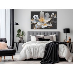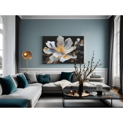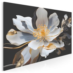 Obraz przedstawia elegancki, stylizowany kwiat o białych płatkach z delikatnymi złotymi akcentami. Na ciemnym tle kompozycja nabiera luksusowego i wyrazistego charakteru, a złote detale podkreślają subtelną strukturę płatków i pręcików kwiatu.