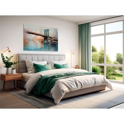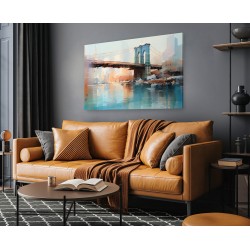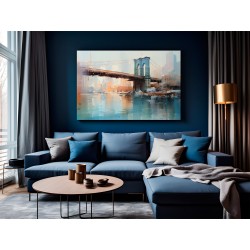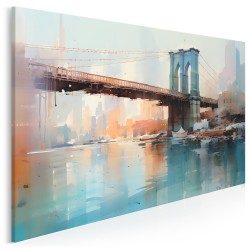 Majestatyczny most rozciąga się nad spokojnym zbiornikiem wodnym, a jego odbicie migocze poniżej. Linia horyzontu w tle nawiązuje do tętniącego życiem miasta, a stonowane kolory sugerują atmosferę wczesnego poranka lub późnego popołudnia.