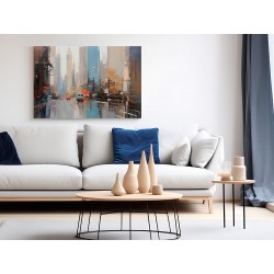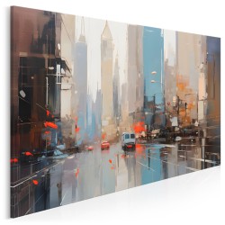 Tętniąca życiem ulica miasta jest przedstawiona w abstrakcyjnym stylu, z rozmytymi kształtami i plamami żywych kolorów, które sugerują ruch i energię miejskiego życia. W tle wyłaniają się wieżowce, a na pierwszym planie dominują odbicia na mokrej drodze i pędzący pojazdy.