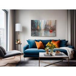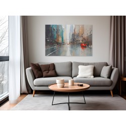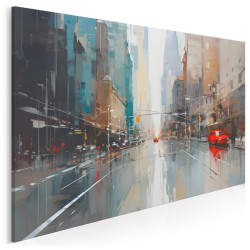 Nowoczesny obraz inspirowany pejzażem wielkomiejskim, utrzymany w dynamicznej, impresjonistycznej stylistyce. Przedstawia ruchliwe miasto w deszczu, z odbiciami świateł na mokrej nawierzchni. Chłodne odcienie niebieskiego i szarości kontrastują z ciepłymi akcentami czerwonych świateł samochodów, tworząc wyjątkowy klimat energii i nowoczesności.