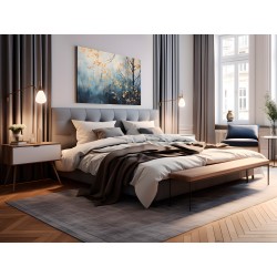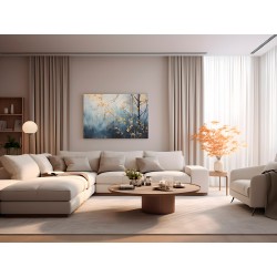 Złote liście trzepoczą na cienkich gałęziach drzew, na tle mglistego, eterycznego tła w odcieniach błękitu i szarości. Scena leśna przywołuje spokojną i tajemniczą atmosferę, a liście zapewniają żywy kontrast ze stonowanymi tonami tła.