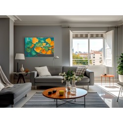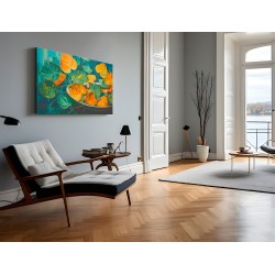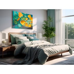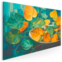 To bardzo energetyczna i pełna życia kompozycja, w której dominują soczyste odcienie zieleni i złocistego pomarańczu. Liście przypominające anturium lub filodendrony zdają się tańczyć w przestrzeni, a ich dynamiczne ułożenie tworzy wrażenie ruchu. Głębia turkusowego tła podkreśla ciepłe barwy liści, sprawiając, że obraz nabiera egzotycznego i lekko surrealistycznego charakteru.