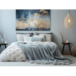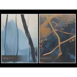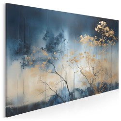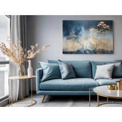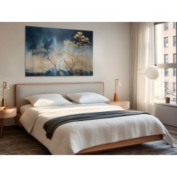 Ten obraz łączy w sobie subtelność natury z abstrakcyjnym tłem w odcieniach granatu i złota. Delikatne gałęzie z kwiatami lub liśćmi wyglądają jakby unosiły się w lekkiej mgle, co nadaje dziełu eteryczny i tajemniczy charakter.
