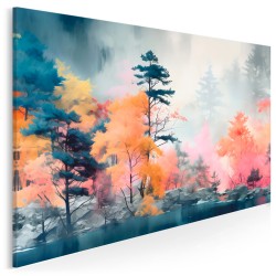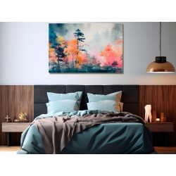 Żywe odcienie pomarańczy i różu zabarwiają liście drzew na tajemniczym, mglistym tle z odcieniami szarości. Spokojny zbiornik wodny odzwierciedla jasne kolory i sylwetki drzew, nadając tej scenie spokojny, ale nieco surrealistyczny charakter.