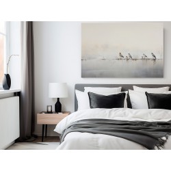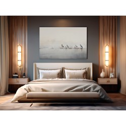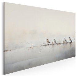 Spokojna scena przedstawiająca rząd ptaków siedzących delikatnie na smukłych gałęziach. Miękkie, stonowane tło sugeruje spokojny, mglisty poranek, rzucając delikatne refleksy na taflę wody.