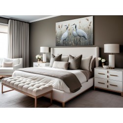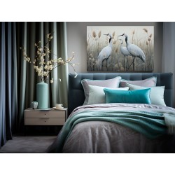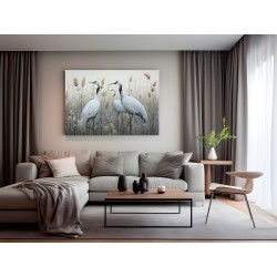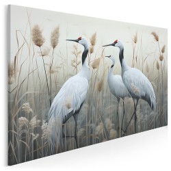 Dwa eleganckie białe żurawie stoją pośród wysokich trzcin, z wdziękiem wyciągając szyje i eksponując długie, smukłe nogi. Dzięki żywym czerwonym detalom głowy i akcentom w dziobach stanowią uderzający kontrast wobec stonowanych odcieni trawiastego tła.
