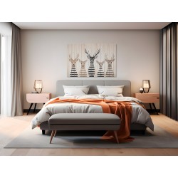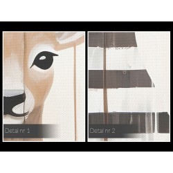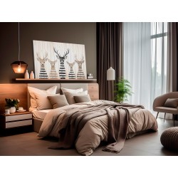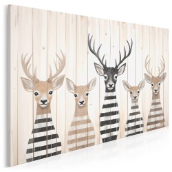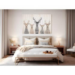 Ten obraz przedstawia stylizowane jelenie na tle drewnianych desek, co nadaje mu rustykalny, skandynawski charakter. Zwierzęta mają subtelne, pastelowe barwy, a ich ciała zdobią czarno-białe paski, co dodaje całości artystycznego, nowoczesnego akcentu.
