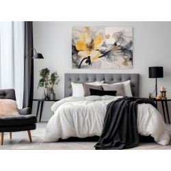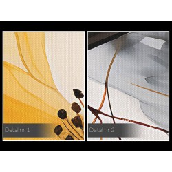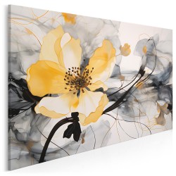 Żywy żółty kwiat wyróżnia się na przydymionym szarym tle z otaczającymi go delikatnymi wirami i włoskami. Cienkie czarne i pomarańczowe linie tworzą abstrakcyjny efekt, nadając całości wrażenie ruchu i płynności.