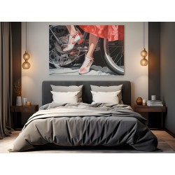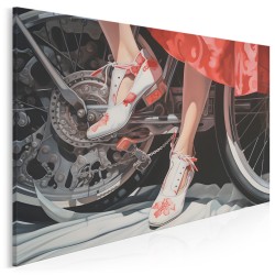 To niezwykle klimatyczny obraz łączący elementy retro z nowoczesnym realizmem. Przedstawia kobiece nogi w eleganckich, białych butach z czerwonymi detalami, oparte na mechanicznych elementach motocykla lub roweru. Kontrast delikatnych, kobiecych detali – koronkowych wzorów, wiązań i subtelnych odcieni skóry – z surową, techniczną konstrukcją maszyny nadaje kompozycji niepowtarzalnego charakteru.